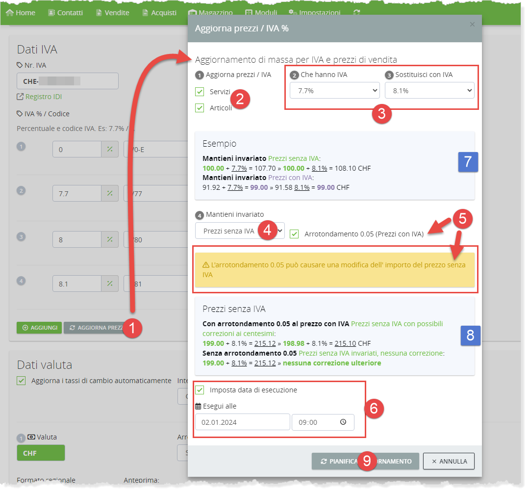 Per aggiornare le aliquote IVA (dal 01.01.2024 ci sono nuove aliquote), si devono creare le nuove percentuali e poi modificare in automatico i prezzi di servizi e/o articoli a magazzino.