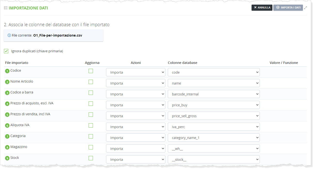 Nei file che si usano per importare i dati, ci sono dei campi che devono essere presenti in modo obbligatorio corretto.