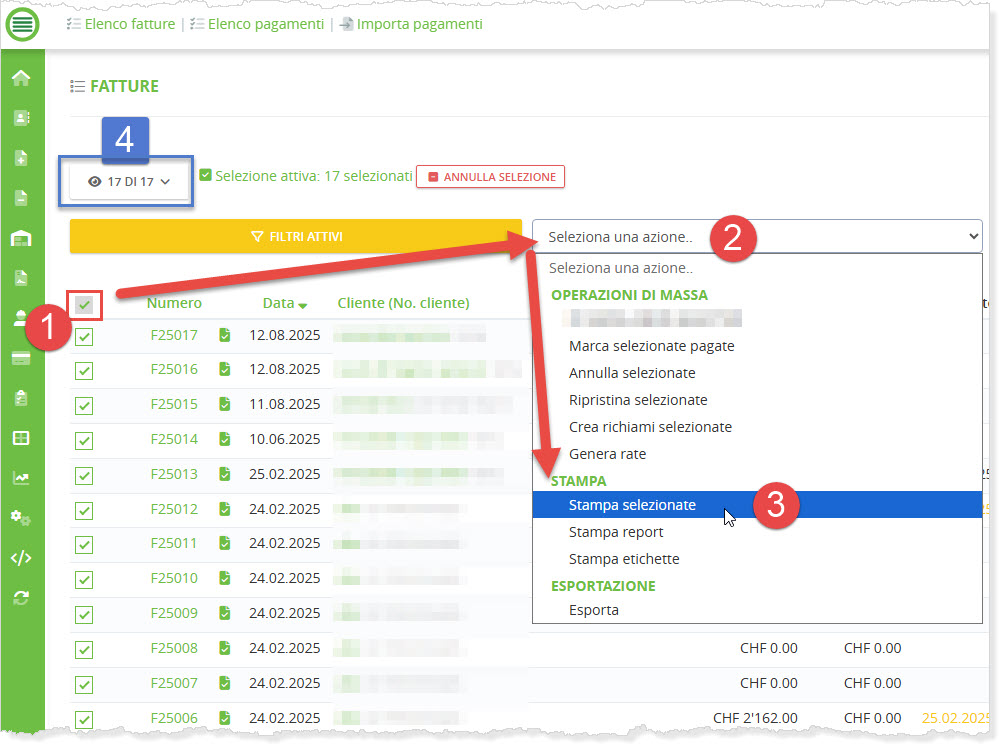 Dall’elenco fatture, avete la possibilità di generare in massa un unico pdf contenente tutte le fatture selezionate.